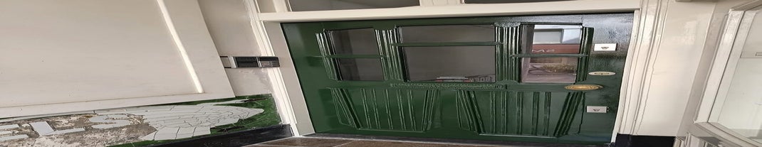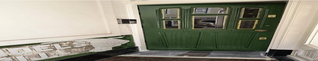 Monumentale deur gerenoveerd; kozijndelen vervangen door nieuw hout - drempel vervangen en alles geschuurd en geverfd.